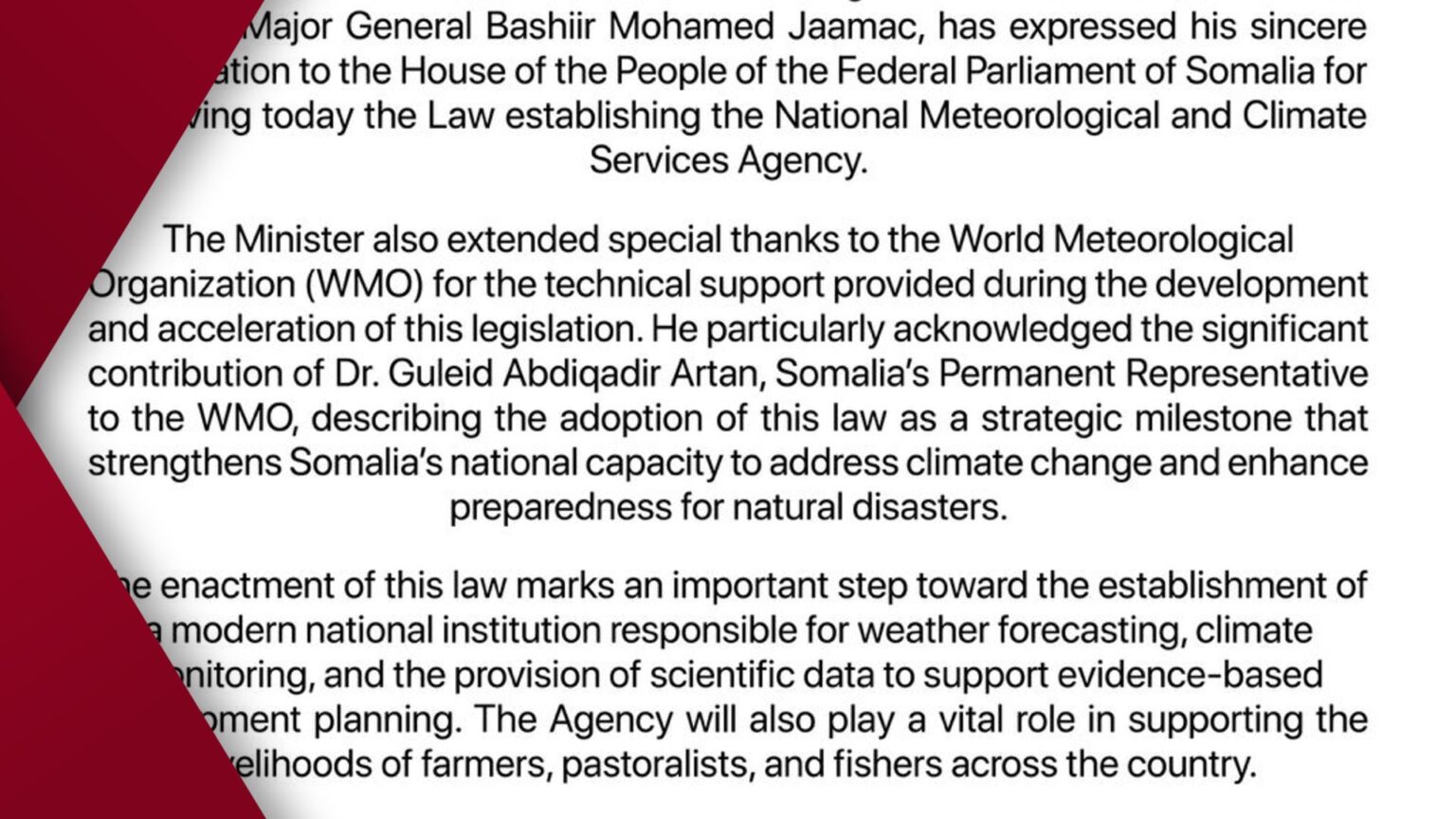 The Minister of Environment and Climate Change, Major General Bashiir Mohamed Jaamac, expressed his gratitude to the House of the People for passing the legislation and thanked the World Meteorological Organization (WMO) for its technical support. Dr. Guleid Abdiqadir Artan, Somalia’s Permanent Representative to the WMO, played a key role in facilitating the adoption of the law.