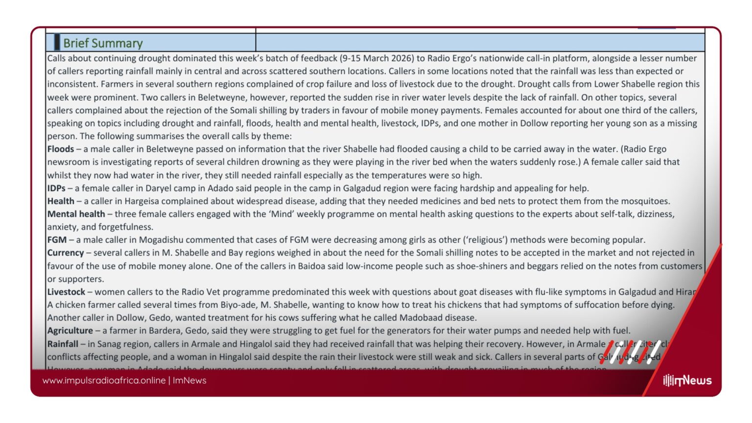 The Radio Ergo Weekly Feedback Report serves as an important reminder of the ongoing challenges faced by the Somali population.